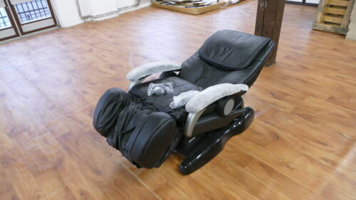 Masážní křeslo SH-211CR černé barvy, křeslo má značně poškozené koženkové čalounění.