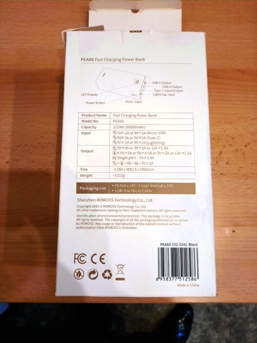Powerbanka Romoss je navržena tak, aby byla zcela bezpečná při používání. Zařízení má ochranu proti přebíjení, přetížení, přílišnému vybití, přepětí, přepólování, zkratu atd. To vám umožňuje používat PEA60 bez obav o poškození.